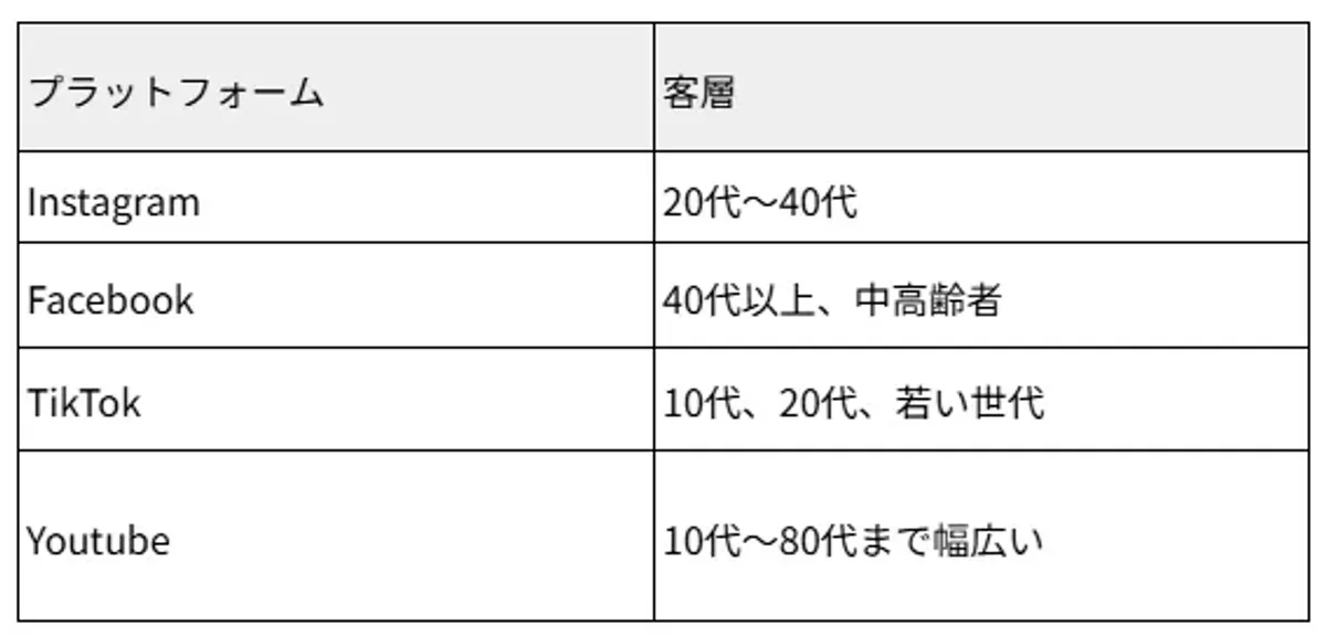 特に台湾では、プラットフォームごとに利用者層が異なるため、それぞれの特徴を理解した上で戦略を立てることが重要です。以下の表では、台湾におけるプラットフォーム別の客層の違いをまとめています。