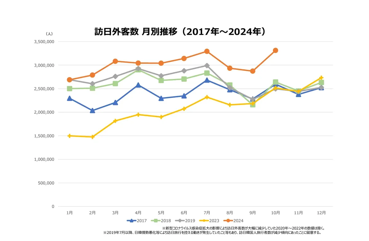 日本政府観光局(JNTO)の「訪日外客数」図表を見ると、2017年~2024年における月間の訪日外国人観光客数の変化がわかります。