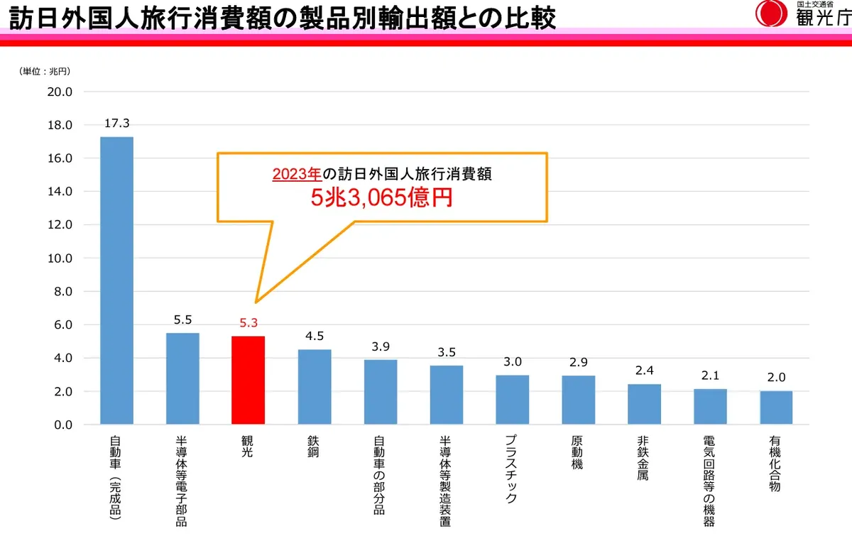 年々増加する訪日外国人観光客に伴い、旅行中の一人当たりの消費額も急速に拡大しています。2023年の訪日外国人旅行消費総額は5兆3,065億円に達しました。観光庁の「訪日外国人旅行消費額の製品別輸出額との比較」図表によると、日本の主要製品別輸出額では、観光は僅かな差で、半導体等電子部品に次ぐ第3位を記録しました。インバウンド観光が日本経済を支える重要な産業であることが明白です。